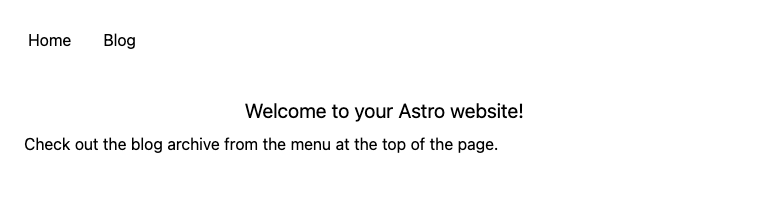 1 2 3 4 5 6 7--- import BaseLayout from '../layouts/BaseLayout.astro'; --- <BaseLayout title="Welcome to your Astro website!"> <p>Check out the blog archive from the menu at the top of the page.</p> </BaseLayout>